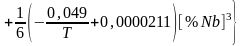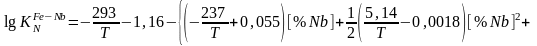 можна прийняти рівним нулю навіть для сплавів зі вмістом ніобію до 50% мас. Однак для сплавів з більш високим вмістом ніобію необхідно враховувати величину параметра взаємодії третього порядку. З урахуванням отриманих виражень параметрів взаємодії, залежність, що узагальнює логарифм константи рівноваги абсорбції азоту залізоніобієвими сплавами може бути записана в такий спосіб: