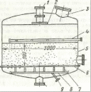 Мал.1. Механічний напірний фільтр: 1 - патрубок підведення освітлюваної води і відведення промивальної води; 2 - відбивний щиток; 3 - лаз; 4 - промивна система; 5 - фільтруючий матеріал; 6 - дренажна система; 7 - стояк для стислого повітря; 8 - повітропровід; 9 - труба підведення стислого повітря; 10 - патрубок виходу освітленої води