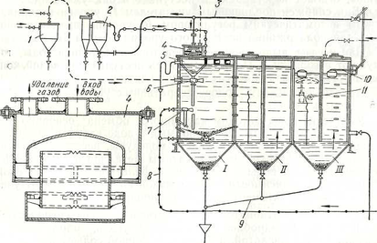 закриті герметично кришками. Відділення повідомляються між собою щелевидними вирізками і мають конічні днища з дренажними трубами 9 для видалення шламу. Хімічні реакції і зм'якшування води відбуваються в реакторі, розділеному на три відсіки подовжніми перегородками. Над верхньою частиною середнього відсіку поміщається головка 7, в яку поступає зм'якшувана вода. Усередині головки є два гідравлічні затвори, утворені циліндром і двома знімними тарілками. Під головкою знаходиться приймач 5, в який поступають розчин соди з дозатора 2 і вода. До нижньої частини приймача приєднаний ежектор 6, працюючий на гострій або відпрацьованій парі, попередньо обчищеному від масла.