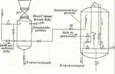 Розпушування проводиться звичайною водою, а за наявності спеціального бака - водою, що вийшла при попередній регенерації. Для цього відкривають засувку 1 (мал.4) на лінії підведення розпушуючої води, а потім засувку 2 для зливу її в каналізацію. Вода під натиском подається 15 - 20 мін. Проби відбираються через вентиль 7. Спочатку в них буде муть, що свідчить про вимивання шкідливих домішок