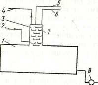 Мал.5. Схема термічного струменевого деаератора: 1 - живильний бак; 2-паропровід; 3 - деаераторна головка; 4 - трубопровід для відведення пароповітряної суміші; 5 - трубопровід для конденсату; 6 - трубопровід для додаткової води; 7 - діркова тарілочка; 8 - живильний насос