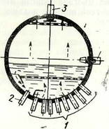 Рис 8. Сепараційний пристрій при підводі пароводяної суміші в водяний простір котла під дірковий лист, розташований в барабані горизонтально: 1 - підйомні труби; 2 - опускні труби; 3 - паровідвідні труби.