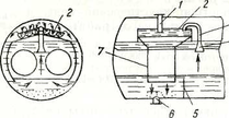 На мал.7 показаний пристрій сепарації відбійно-щитового типу. Відбійні щити, розташовані по обох сторонах і по всій довжині барабана, направляють пароводяну суміш в середню частину барабана. Така схема розташовує відбійних щитів дозволяє рівномірно розподіляти пару в паровому просторі казана. Шиті утворюють щілини, при виході з яких пароводяна суміш розділяється: вода стікає, а пара прямує до виходу з барабана.