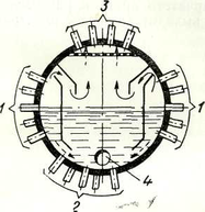 Рис. 7 Сепараційний пристрій відбійно-щитового типу: 1 - підйомні труби; 2 - опускні труби; 3 - паровідвідні труби; 4 - труба для подачі живильної води