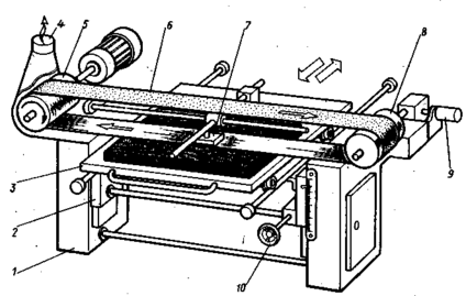 Ленточный шлифовальный станок с подвижным столом и коротким утюжком (рис. 3) предназначен для шлифования щитов. Станина станка выполнена в виде двух тумб 1, на которых размещены суппорты 2, переставляемые по высоте маховичком 10. Стол 3 на роликах перемещают вручную или от механического привода в поперечном направлении по круглым направляющим, прикрепленным к суппортам. Над столом расположена лента 6, которая надета на приводной 5 и неприводной 8 шкивы. Натягивают ленту и регулируют ее набегание винтовым устройством с пневмоцилиндром 9.