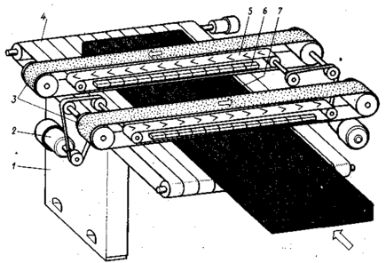 В других станках нижняя опорная поверхность утюжка воздействует на шлифовальную ленту через неподвижную промежуточную войлочную антифрикционную ленту с приклеенным слоем мелких стеклянных шариков. Поверхность шариков резко снижает коэффициент трения утюжка об антифрикционную ленту, что предотвращает нагрев и быстрый износ шлифовальной ленты. Обрабатываемая деталь 7 подается в станок ленточным конвейером 4. Он смонтирован на станине с возможностью вертикального перемещения посредством рычажной системы. Привод конвейера осуществляется от индивидуального электродвигателя через цепной вариатор и редуктор. Скорость подачи можно регулировать бесступенчато от 2 до 14 м/мин.