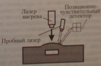 В лабораторных исследованиях иногда используют специфический способы тепловой стимуляции и регистрации температуры. Высоким температурным разрешением обладает техника «миража», которая предусматривает нагрев и регистрацию температуры с помощью лазера (рис. 2, и). Над дефектом создаётся область повышенной температуры прилегающего воздуха при прохождении через которую пробный луч лазера претерпевает отклонение, пропорциональные температуры и регистрируемые позиционно-чувствительным фотодетектором. Другой пример комбинирование техники НК показан на рис 2, к: при нагреве лазером слои материала, расположенные над дефектом, испытывают аномальные деформации, которые фиксируют с помощью второго (пробного) лазера и позиционно-чувствительного фотодетектора.