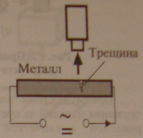 В ряде случаев металлы нагревают, пропуская через них электрический ток (рис. 2, в). Этот способ также не создаёт оптической помехи и эффективен при обнаружении трещин, расположенных перпендикулярно направлению линий тока. Применение такого вида нагрева создаёт проблему ввода в изделие мощных токов.