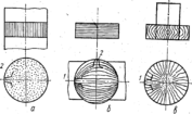 | Рис.3.1. Макроструктура зубчатых колес, изготовленных: а - из проката; б - штамповкой из полосы; в - осадкой из прутка | |