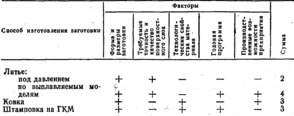 Анализируя степень влияния рассмотренных выше факторов, выбирают один или несколько технологических процессов, обеспечивающих получение заготовок требуемого качества. Одновременно проверяют возможность использования комбинированных заготовок. На предварительном этапе выбора оптимального способа получения заготовок можно воспользоваться так называемой матрицей влияния факторов (табл.3.1). Оценка каждого фактора в ней производится «плюс - минус» или с помощью коэффициента удельного веса (от 0 до 1). Лучшим считается способ, набравший большее число плюсов или большую сумму коэффициентов.