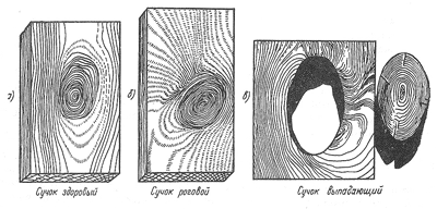 Сучки – живые и отмершие, закрытые и заросшие, здоровые и загнившие представляют собой части ветвей, заключенные в древесине. Они нарушают однородность строения древесины, затрудняют обработку пиломатериалов, нарушают правильность распределения внутренних напряжений, снижают прочность древесины и, следовательно, ее сортность.