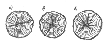 Отлупные трещины – неполные и кольцевые – внутренние трещины, проходящие в зоне ядра или спелой древесины между годичными слоями. Отлуп как порок особенно часто встречается у дуба, осины, пихты, тополя, ели. Как и метиковые, отлупные трещины образуются при раскачке дерева ветром и при резкой смене температуры. Метики и отлуп, возникнув у растущего дерева, увеличиваются в своих размерах в срубленном дереве при его высыхании.