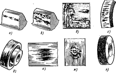 В подшипниках качения вследствие различных причин (рис. 2, а—г) износу подвержены рабочие поверхности — на них появляются оспинки, наблюдается шелушение поверхностей беговых дорожек и шариков. Под действием динамических нагрузок происходит их усталостное разрушение; под влиянием излишне плотных посадок подшипников на вал и в корпус шарики и ролики защемляются между кольцами, в результате чего возможны перекосы колец при монтаже и другие нежелательные последствия.