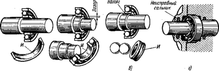 а — вследствие перекоса, б — при проворачивании внутреннего кольца на валу, в — из-за чрезмерного натяга, г — из-за неисправного сальника; И — места износа