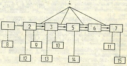 Рис. 4.1 - Структурная схема установки для ионно-лучевого легирования: 1 - система напуска рабочего вещества; 2 - источник ионов; 3 - система формирования ионного луча; 4 - ионопровод; 5 - сепаратор ионов; 6 -система откачки; 7 - камера с образцами; 8 -11 - системы откачки; 12 - блок питания ионного источника; 13 - блок вытягивающего и фокусирующего напряжения; 14 - блок питания сепаратора ионов; 15 - блок контроля дозы облучения