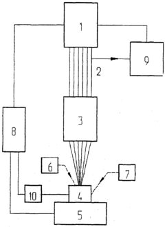 Рис. 3.1 - Структурная схема лазерной технологической установки: 1 - оптический квантовый генератор (лазер); 2 - лазерное излучение; 3 - оптическая система; 4 - обрабатываемый объект; 5 -устройство для перемещения обрабатываемого объекта; 6 - устройство для подачи защитного газа; 7 - источник вспомогательной энергии; 8 - программное устройство; 9 - датчик контроля параметров излучения; 10 - датчик технологических параметров