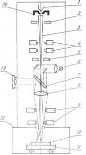 В настоящее время существуют две основные системы управления лучом. В первой системе луч движется по поверхности обрабатываемой детали, и линия обработки совпадает с траекторией движения луча. Движение луча задается либо ЭВМ, которая управляет отклоняющей системой 9, либо светокопировальным устройством, которое состоит из фотошаблона, осветительной системы и фотоэлектронного усилителя (ФЭУ). Свет, проходя через фотошаблон, попадает на ФЭУ, усиливается в нем и в качестве управляющего сигнала поступает на отклоняющую систему. В некоторых случаях по заданной программе может двигаться рабочий стол. Во второй системе луч последовательно проходит всю поверхность детали по строчкам, а специальное устройство отпирает электронную пушку лишь в местах обработки.