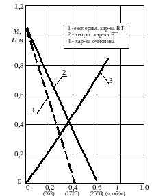 Для порівняння результатів експериментальних і теоретичних досліджень були побудовані моментні характеристики приводу та очисника, які зображені на рис. 10. Перетинання характеристик приводу з характеристикою очисника дозволило визначити справжню швидкість обертання фільтроелемента. Відносна похибка визначення кутової швидкості обертання фільтроелемента очисника теоретичним та експериментальним способами склала не більш 20–25%.
