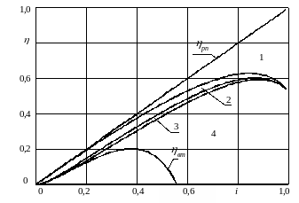 Рис. 7 – Структура втрат енергії у ВТ: рп – теоретичний ККД робочого процесу ВТ; вт – справжнє значення ККД ВТ; 1 – зниження ККД, обумовлене впливом кінцевої кількості лопаток; 2 – зниження ККД, обумовлене гідравлічними втратами; 3 – зниження ККД, обумовлене об'ємними втратами; 4 – зниження ККД, обумовлене механічними втратами.