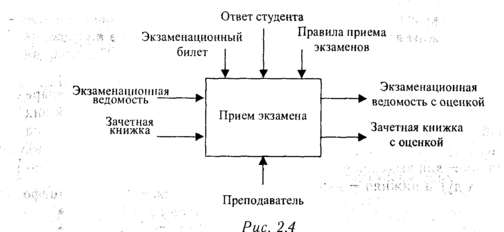 Пример. Процесс приема экзамена. Задача этой функции заключается в том, чтобы поставить оценки в экзаменационную ведомость и зачетную книжку. В качестве "механизма" здесь выступает преподаватель, который руководствуется содержанием экзаменационного билета, ответом студента и правилами приема экзаменов.
