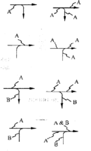 Слияние дуг, изображаемое в виде сходящихся вместе линий, указывает, что содержимое каждой ветви идет на формирование метки для дуги, являющейся результатом слияния исходных дуг. После слияния результирующая дуга всегда помечается для указания нового набора данных (объектов), возникшего после объединения. Кроме того, каждая ветвь перед слиянием может помечаться в соответствии со следующими правилами: