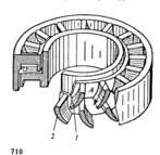 Резинометаллический подшипник состоит из нескольких ступеней. Каждая ступень включает подпятник, закрепляемый в корпусе, и диск, сидящий на валу турбобура. Кольцо служит для защиты вала турбобура от изнашивания и для обеспечения заданного расстояния между дисками пяты. Подпятник по дисковой части облицован резиной, т.е. по верхней, нижней и внутренней цилиндрической поверхностям. Корпус подпятника имеет каналы для пропуска промывочной жидкости.