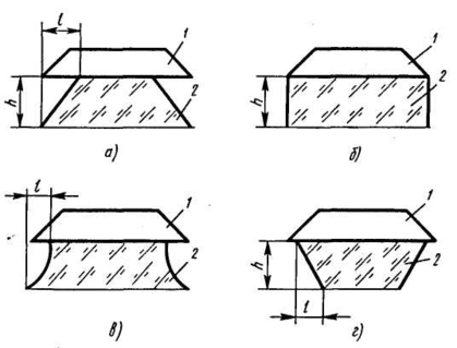 При плохой адгезии слоя фоторезиста травитель может проникать под него на значительное расстояние и в этом случае боковое подтравливание l становится недопустимо большим. При хорошей адгезии фронт бокового травления (клин травления) имеет форму дуги (Рисунок 5, а). Клин травления зависит от скорости процесса, адгезии защитной маски фоторезиста к подложке, толщины вытравливаемого слоя h и смачиваемости его поверхности травителем.