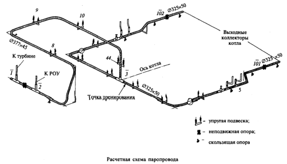 Паропровод может находиться в нескольких состояниях: монтажном, холодном и рабочем. В монтажном состоянии вся трасса трубопровода опирается на промежуточные монтажные крепления, при этом внутренние напряжения в паропроводе минимальны (в идеальном случае они имеют нулевые значения). В холодном состоянии на паропровод действуют массовые распределенные и сосредоточенные нагрузки, а также реакции элементов опорно-подвесной системы. В этом случае внутренние напряжения обычно максимальны, а упругая ось паропровода наиболее деформирована.