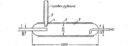 Рис. 3. Гидратоуловитель.1 - шлейф; 2 - корпус; 3 - выкидная труба; 4 - предохранительная сетка;.5 - линия сброса конденсата; 6 - -паровая рубашка.