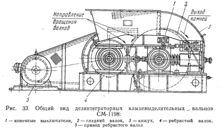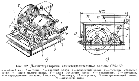 Ребра меньшего валка выступают над его поверхностью на 10 мм, зазор между валками-12 мм. Дезинтеграторные вальцы практически выделяют камни величиной лишь более 10 мм, а часть крупных камней дробят. Эти вальцы применяют преимущественно в качестве машины для грубого дробления плотных и пластичных комкующихся глин. Ими оснащены многие заводы.