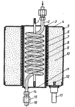 1– труба для термопары; 2 – змеевик; 3 – планка; 4 – днище;5 – кожух; 6 –корпус; 7 – изоляция; 8 – проволока; 9 – обмазка (шамот, глина); 10 – теплоизоляция (асбест); 11 – днище корпуса; 12 – клеммы Л-62; 13 – труба для подвода эл. питания; 14 – полуниппель; 15 – гайка нажимная; 16-конус