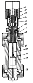 Рисунок 3.8 – Сепаратор высокого давления с указателем уровня – поплавком: 1 – стакан; 2 – катушка; 3 – пружина; 4 – сердечник; 5 – дно стакана; 6 – кольцо; 7 –пробка верхняя; 8 –гайка; 9 – корпус; 10 – труба; 11 – отбойник; 12 – поплавок; 13 – пробка нижняя