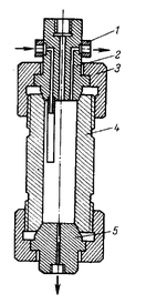 1 – кольцо; 2 – пробка верхняя; 3 – гайка;4 – корпус; 5 – пробка нижняя