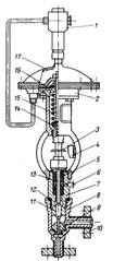 Рисунок 3.7 – Клапан мембранный регулирующий с позиционным реле УКН-ВО: 1–позиционное реле; 2– корпус мембранного механизма; 3–указатель положения; 4 –шкала; 5–набивка сальника; 6 –лубрикатор; 7 – корпус сальника; 8 – корпус клапана регулирующего; 9 – седло; 10 – фланец; 11 –затвор; 12 – обтюратор; 13 – шток; 14 –регулирующий упор; 15 – пружина; 16– мембрана; 17 – крышка мембранного механизма