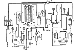 Смесь продуктов реакции из реактора после охлаждения в холодильнике 7, поступает в газосепаратор высокого давления 8 (рис. 1.5) для отделения газовой фазы от жидкой. Газовая фаза - это непрореагировавший водород и образовавшиеся в процессе гидрогенизации газы. Жидкая фаза - это жидкие продукты реакции и жидкие углеводороды, не участвовавшие в процессе. Разделение производят при 293-303 К и давлении, близком к давлению в реакторе.