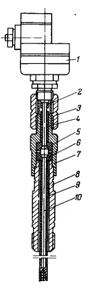1–индикатор уровня; 2– соединительная втулка (латунь); 3–гайка соединительная; 4– втулка (текстолит, фторопласт); 5 –стержень (Х18Н9Т); 6– вкладыш (текстолит); 7, 8 –ниппель; 9 –чехол (текстолит, фторопласт); 10–стержень