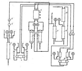 Сепаратор объемом 1,7 л изготовлен из трубы (8 3X5, сталь 1Х18Н9Т) и рассчитан на атмосферное давление и температуру 293 К. Циркуляционные газы перед поступлением в реакционное устройство проходят очистку в фильтре и (рис.3.14) аппарате высокого давления объемом 2 л, рассчитанном на давление 30 МПа и температуру 523 К, изготовленном из стали 1Х18Н9Т. Внутри аппарата помещена перфорированная труба с фильтрующим материалом, поверхность фильтрации 0,05 м2. При отдувке диоксидом углерода газ из баллона, пройдя ловушку 17 , сварной аппарат диаметром 100 мм и 250 мм, поступает в отдувочную колонну. Опытная установка, представленная на рис.3.15, имеет реакционное устройство, представляющее собой блок из трех реакторов, в каждом из которых можно вести самостоятельные исследования. При необходимости они могут соединяться последовательно.