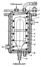 С наружной поверхности по корпусу приварена рубашка 6 для обогрева аппарата водяным паром под давлением 1,2 МПа. Внутри аппарата помещен алюминиевый поплавок, который с повышением уровня открывает отверстие для выгрузки.