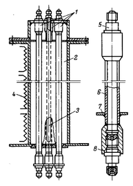 Рисунок 3.16 – Блок реакторов:1 – реактор; 2 – ванна; 3 – карман для термопары; 4 – электро-обогрев (проволока, Х20Н80); 5 – ниппель (4Х14Н14В2МА); 6 – корпус (1Х18Н10Т); 7 – фланец; 8 – обтюратор (М-1)