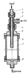 После отдувочной колонны сероводород и легкие фракции с отдувочными газами проходят змеевиковый холодильник 14 , изготовленный из трубки диаметром 10X2 мм, длиной 2,4 м из стали 1Х18Н9Т на давление 30 МПа и температуру от 473 до 29 3 К. Теплопередающая поверхность холодильника 0,025 м. Охлажденная смесь поступает в сепаратор-конденсатор 13, (рис. 3.13) для отделения сконденсировавшихся паров нефтепродуктов от газа. Жидкость сливается через дренаж в нижней крышке 8.