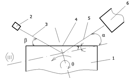 Рис.5. Определение кристаллографического направления: 1 – слиток; 2 – счетчик Гейгера; 3,5 – отраженный и падающий луч; 4 – торец слитка; 6 – рентгеновская трубка.