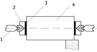Перед шлифовкой к торцу слитка (4) наклеечной мастикой (3) приклеивают центры (2). При этом необходимо выдерживать соосность слитка и лини центров, чтобы припуск на обработку был равномерно распределен по окружности сечения слитка.