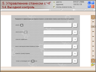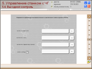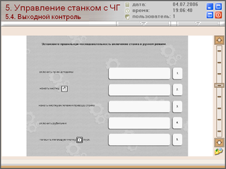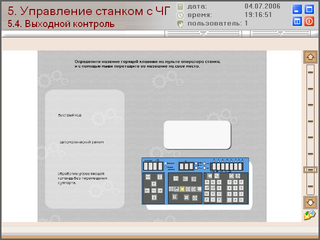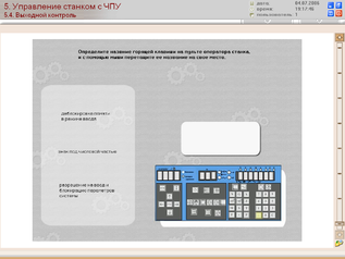 | Определите название горящей клавиши на пульте оператора станка и с помощью мыши перетащите ее название на свое место. | 35 39 | |