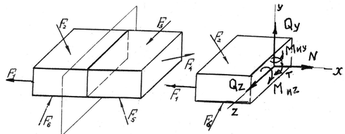 ис. 2Различать нормальные и касательные напряжения необходимо, так как конструкционные материалы по разному сопротивляются их действию (разные величины допускаемых напряжений, модуля упругости и т. д.). Составляющие внутренних сил, связанных с этими напряжениями, определяют с помощью уравнений (1).