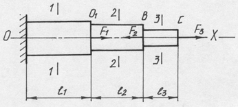 Пример. Определить внутренние силы и напряжения в поперечных сечениях участков с длиной ℓ1, ℓ2, ℓ3, а также перемещения точек приложения внешних продольных сил F1, F2 и F3 ступенчатого стержня (рис. 7). Модули упругости материала участков E1, E2, E3 и величины поперечных сечений постоянны по длинам участков и равны соответственно A1, A2 ,A3.