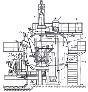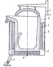 1 – механизм подъема и отворота свода; 2 – тигель; 3– индуктор; 4 – магнитопроводы (ферромагнитные экраны); 5‑кожух; 6 – сигнализатор; 7‑механизм наклона