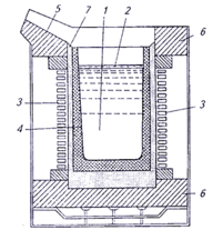 1 – жидкая сталь; 2‑шлак; 3 – водоохлаждасмая катушка индуктора; 4 – огнеупорная футеровка; 5 – сливной носок; 6 – огнеупорный кирпич; 7‑термоизоляция