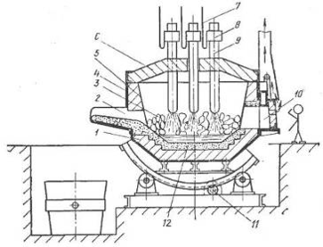 Печь имеет стальной сварной кожух 3. Кожух печи изнутри футерован теплоизоляционным и огнеупорным кирпичом 1, который может быть основным (магнезитовый, магнезитохромитовый) или кислым (динасовый). Подина 12 печи набивается огнеупорной массой. Плавильное пространство ограничено стенками 5, подиной 12 и сводом в, изготовляемым также из огнеупорного кирпича и имеющим отверстия для прохода электродов. В стенках печи имеются рабочее окно 10 для управления ходом плавки и летка для выпуска готовой стали по желобу 2 в ковш.