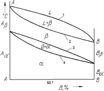 Диаграмма состояния представляет собой графическое изображение состояния любого сплава изучаемой системы в зависимости от концентрации и температуры (рис. 5)