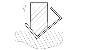 Гибка листового металла осуществляется в результате упруго-пластической деформации. При гибке происходит растяжение наружных и сжатие внутренних слоев материала изгибаемой детали. После гибки растянутые и сжатые слои стремятся возвратиться в исходное положение под действием упругих сил. В следствие этого форма детали после гибки не будет соответствовать форме штампа на некоторый угол за счет упругости, что необходимо учитывать при изготовлении инструмента. При свободной «V» образной гибке усилие определяют по формуле: